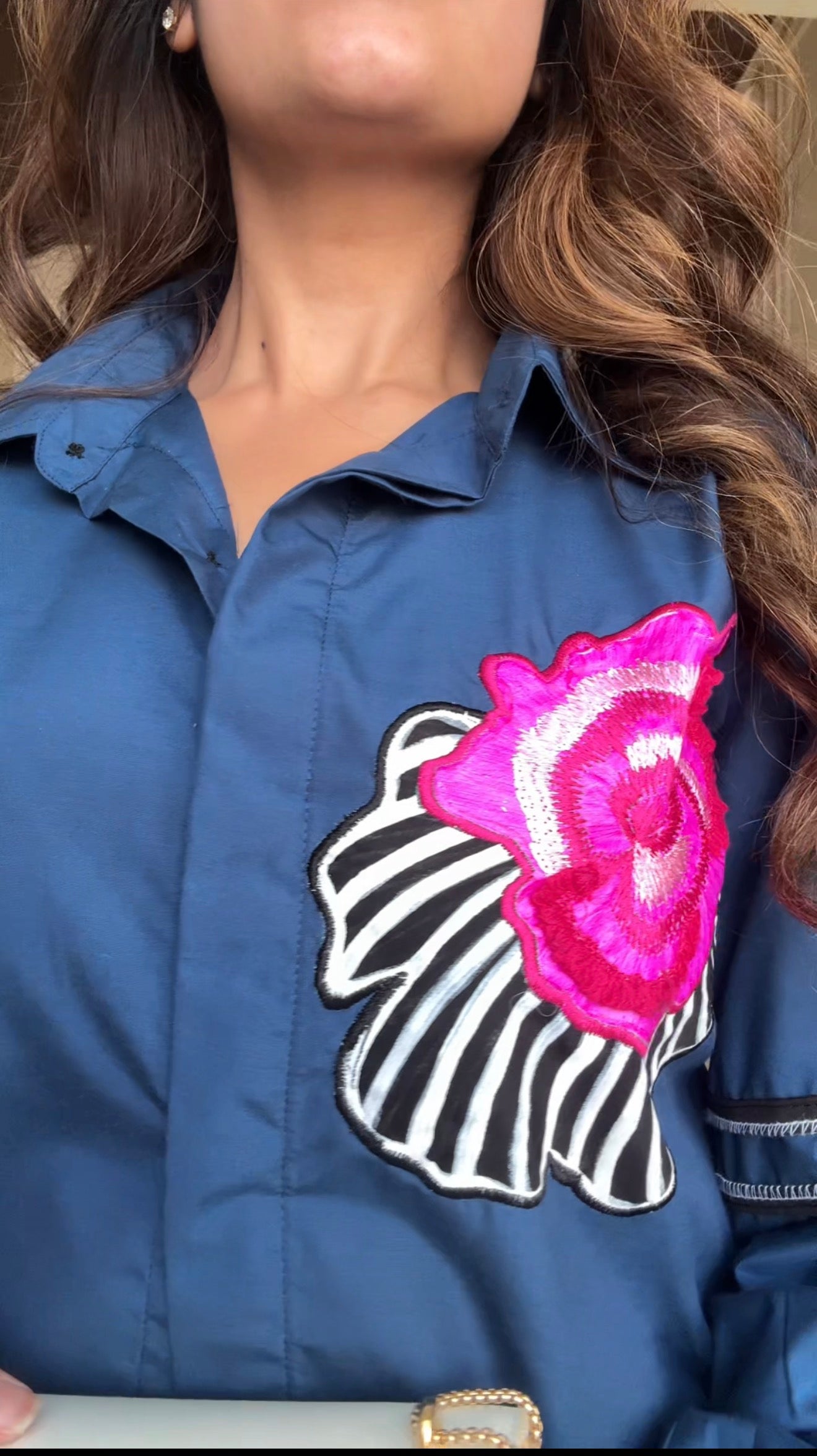 The shirt is cut from premium Giza cotton, prized for its smooth finish and breathable structure. It holds shape while staying light on the skin. The deep navy base creates a strong canvas for the striking floral placement in vivid pink and ivory. The embroidery is bold, deliberate, and positioned to command attention without overwhelming the silhouette. Soft gathers at the sleeves add subtle volume and fluidity.