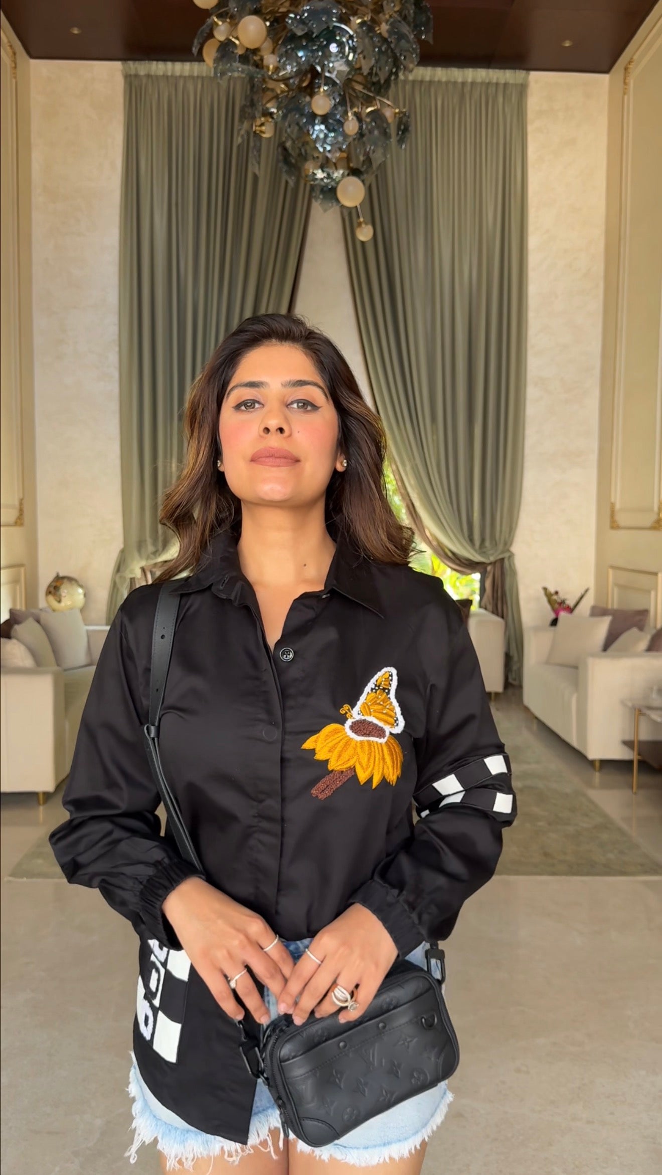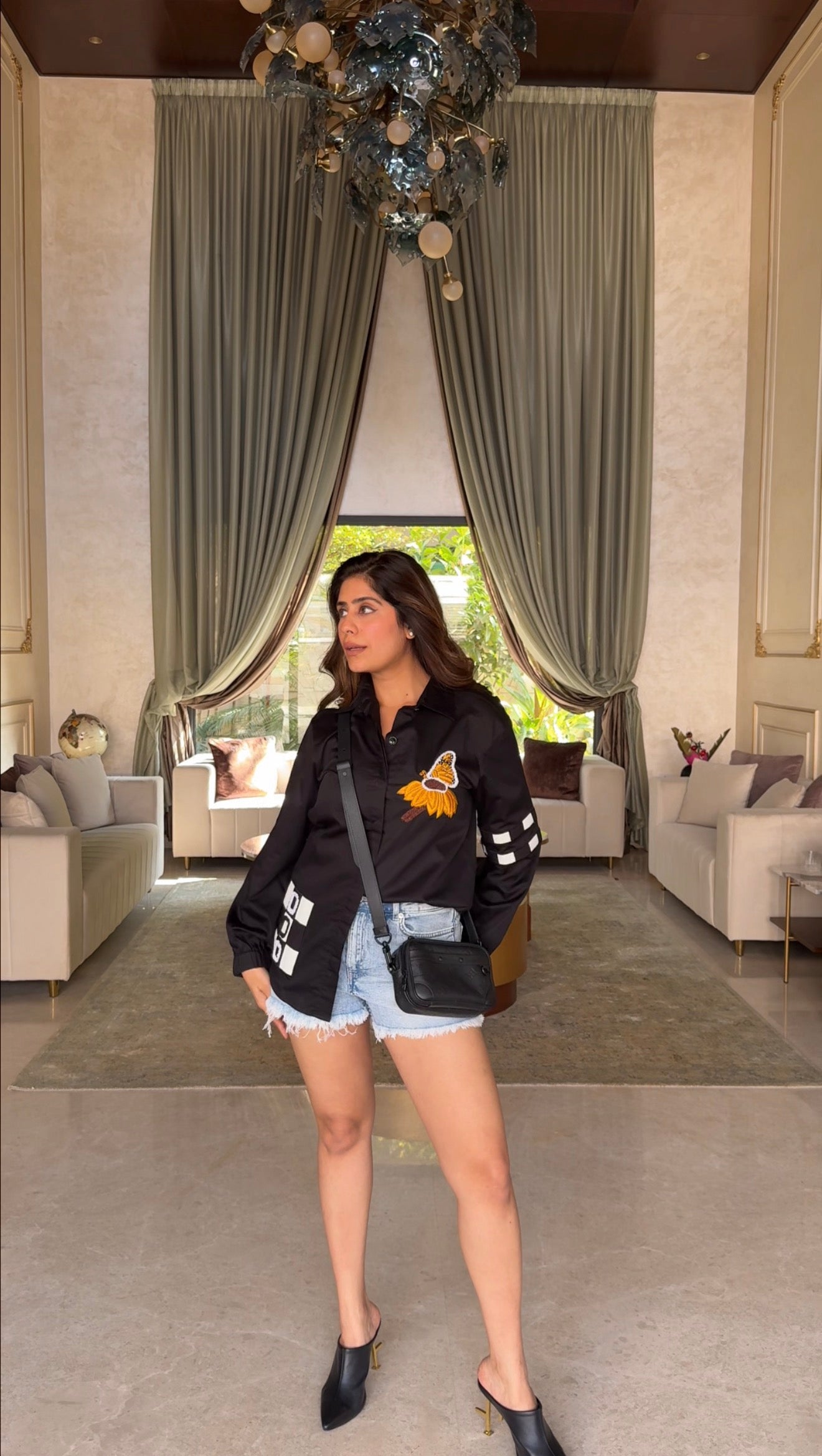 The black shirt is tailored in a relaxed silhouette that falls with ease while maintaining structure. A vivid embroidered butterfly resting over a golden bloom becomes the focal point, bringing life and movement to the dark canvas. Graphic accents placed along the sleeve and hem introduce contrast, giving the piece a contemporary edge without overwhelming its balance.