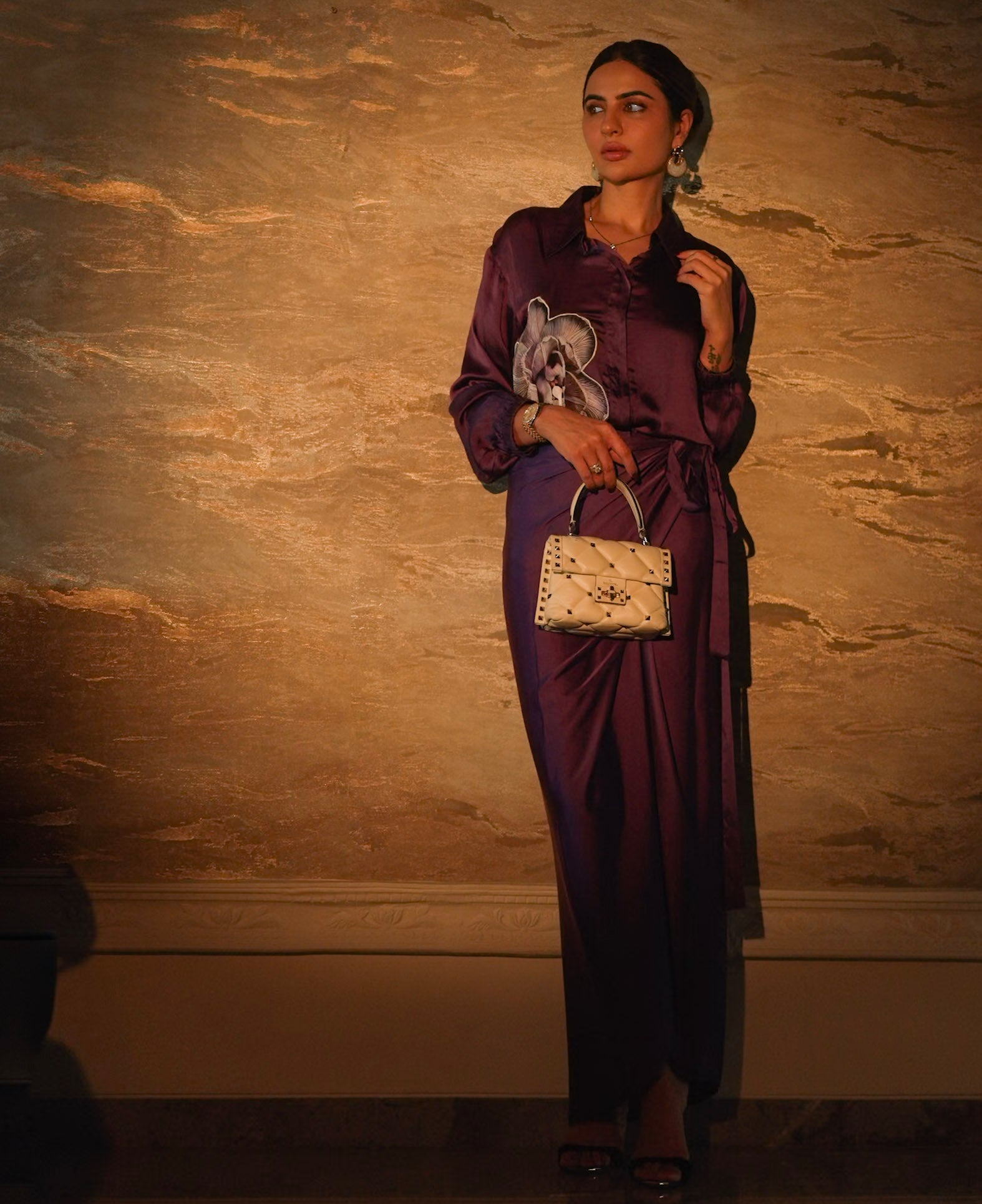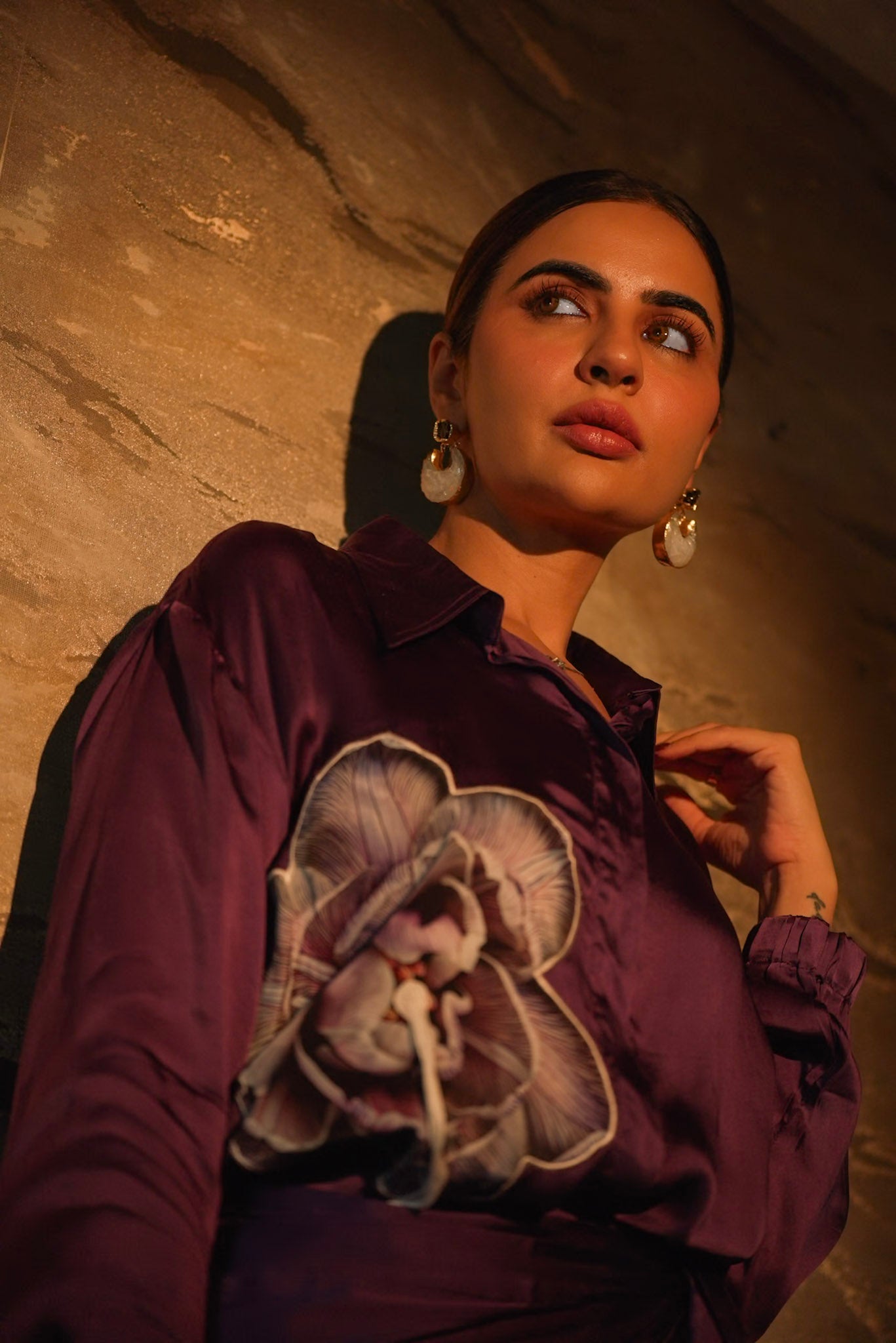 The Velour Plum Co Ord is built for evenings where presence matters. Cut from fluid Bemberg silk satin, this set moves with a soft sheen and a smooth fall that feels refined against the skin. The rich plum tone brings depth and drama, while the floral placement on the shirt adds a quiet statement that feels intentional and rare.